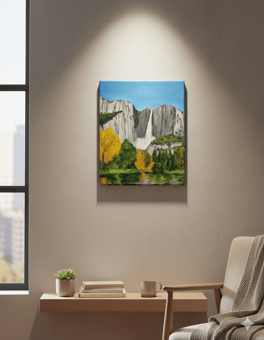 Presenting "Valley Majesty"—an original 8x10 inch acrylic painting. This piece captures the breathtaking grandeur of Yosemite in a striking, compact format, perfect for bringing the outdoors in.