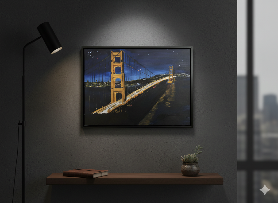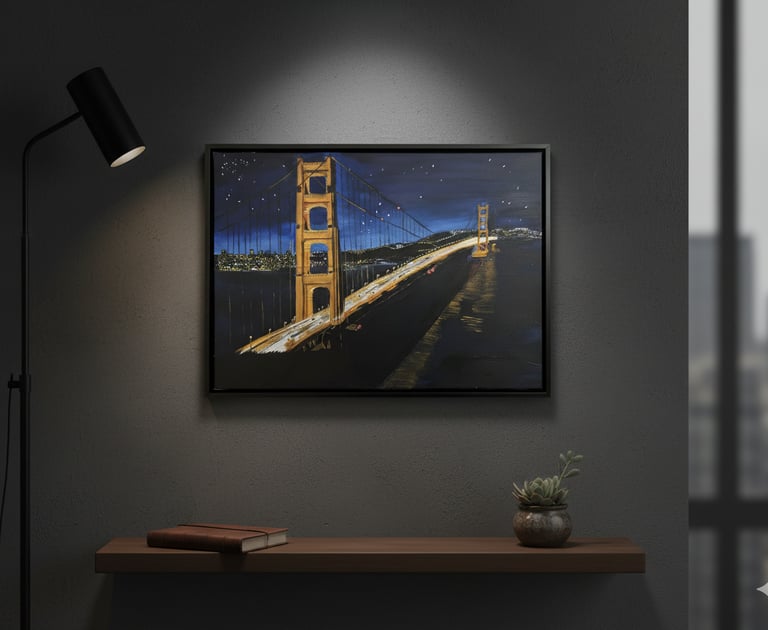 The Golden Gate Bridge, a timeless icon, brought to life on an 9x12 inch canvas. In this painting, every layer of acrylic paint works to tell a story of light, shadow, and the enduring magic of the city by the bay.