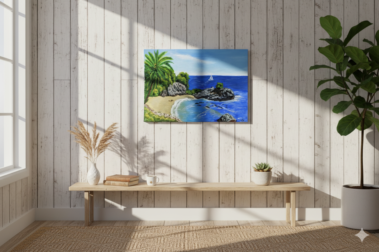This original 9x12 inch acrylic painting is an invitation to a sun-drenched shore. The soft, luminous palette of the water and sky creates a peaceful atmosphere, while the rich, vibrant colors of the beach bring the scene to life..
